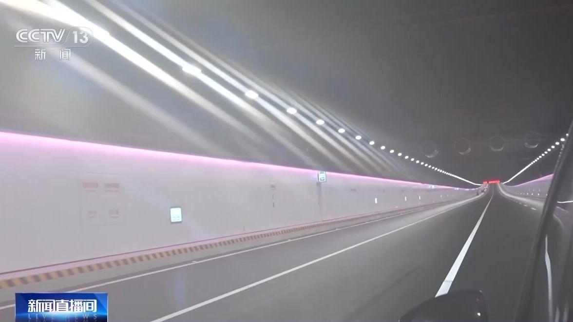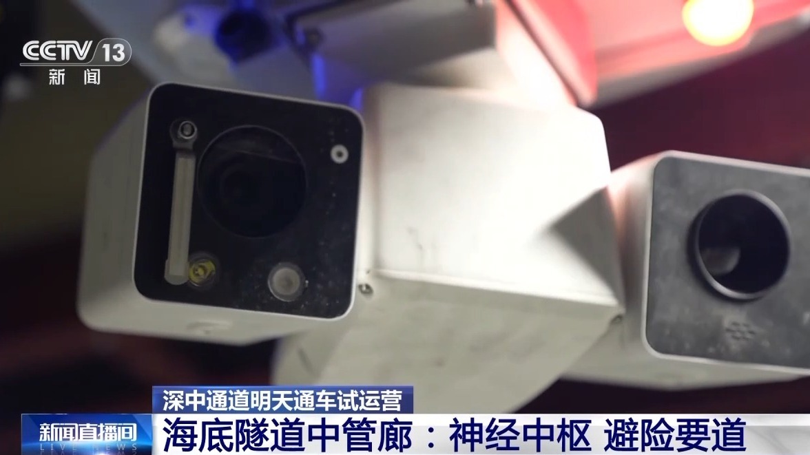 总台记者 秦芊茗:我现在就是在深中通道的海底沉管隧道中,在隧道内侧的墙上每隔80米就有一个这样的安全门,通过这个安全门我们可以直接来到中管廊,在中管廊里面包含通信、通电还有消防等设备,相当于是整个沉管隧道的“神经中枢”。除此之外,它还可以当作是一道安全门,当我们发生了紧急状况的时候,就可以直接通过中管廊来到对面的车道进行逃生。