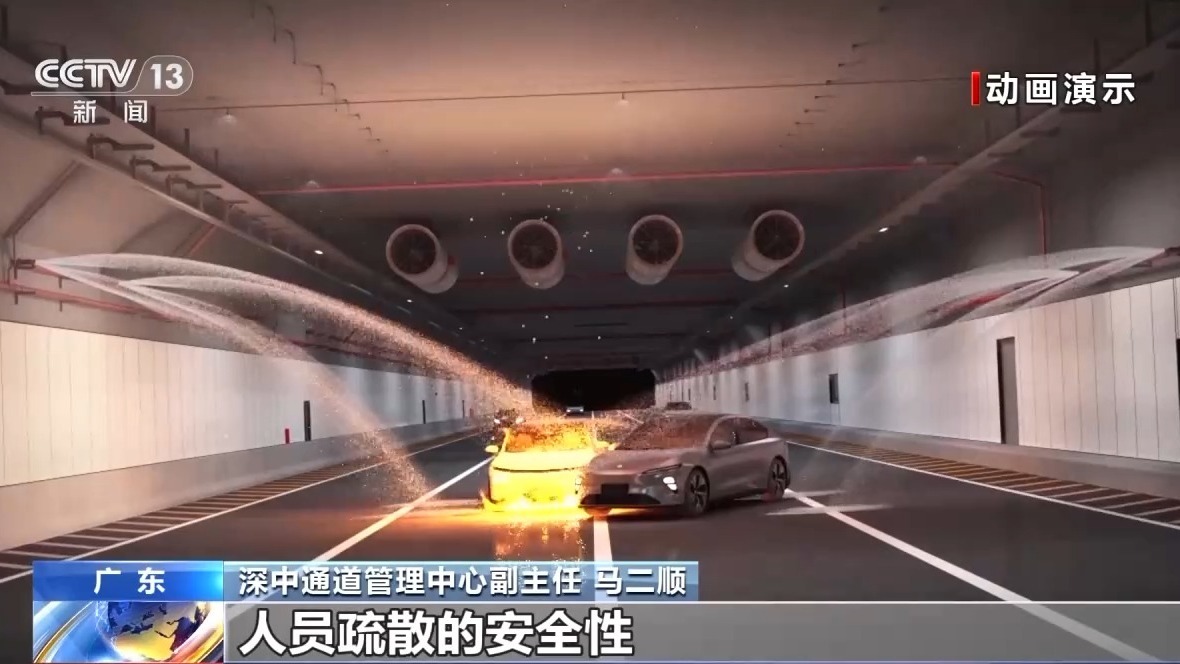 深中通道管理中心副主任 马二顺:我们首创的海底沉管隧道顶部横向排烟道技术,使排烟效率提高了42%,并创立了超宽断面及互通式海底隧道的新型防火排烟技术体系,有效保证了在火灾工况下人员疏散的安全性。
