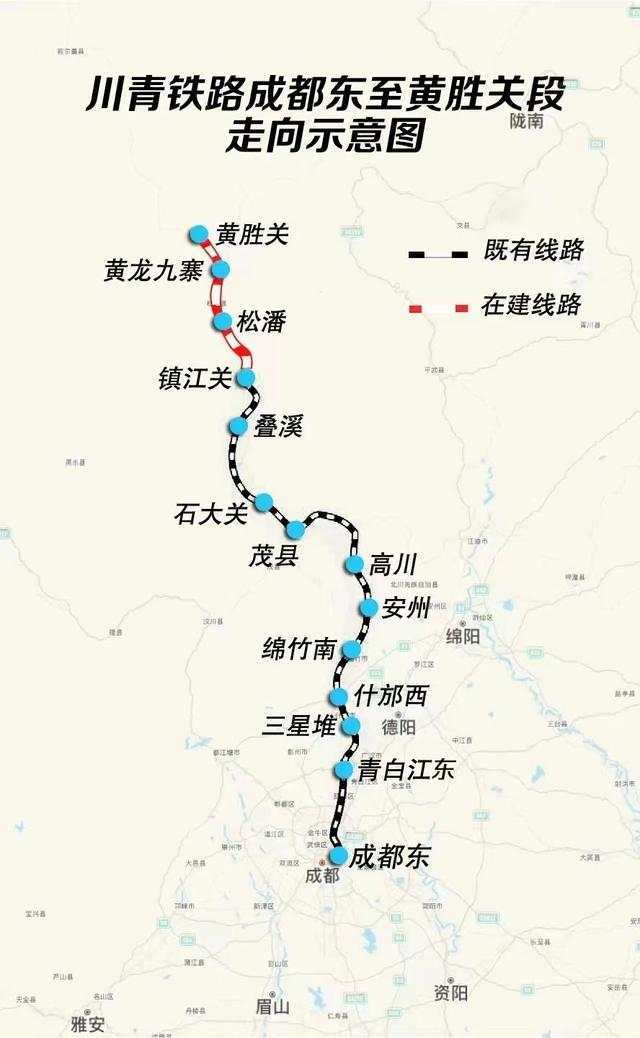 川青铁路起自成都东站,经四川省成都市、阿坝藏族羌族自治州,甘肃省甘南藏族自治州,青海省黄南藏族自治州、海东市、西宁市,接入西宁站,正线全长约836公里,设计时速200公里,为国家Ⅰ级双线铁路。此次铺轨完成的是镇江关至黄胜关段。线路全长约148.458公里,正线铺轨133.96公里、站线铺轨14.498公里、道岔67组。