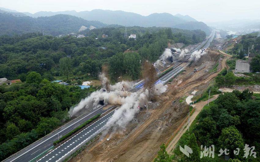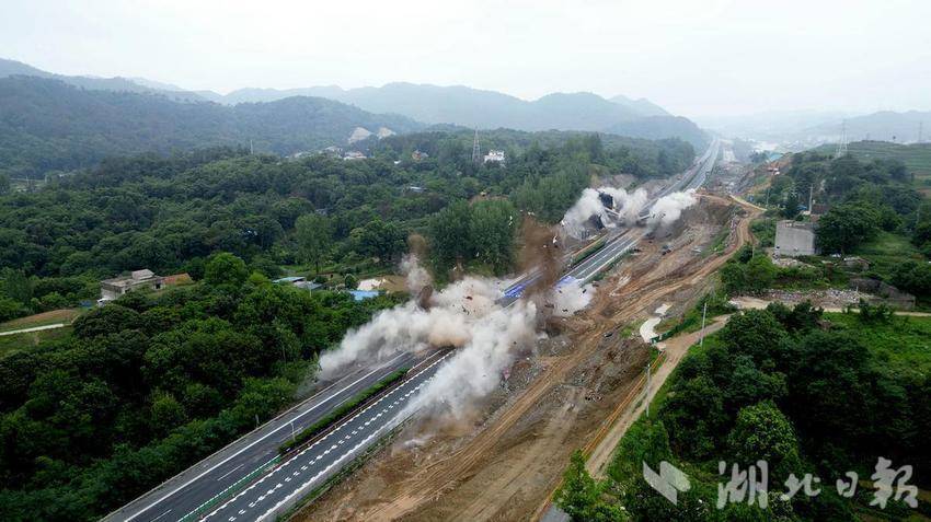 6月30日,京港澳高速大悟段,2座跨线桥同步爆破瞬间。(湖北日报全媒记者 柯皓 通讯员 吴迪 摄)