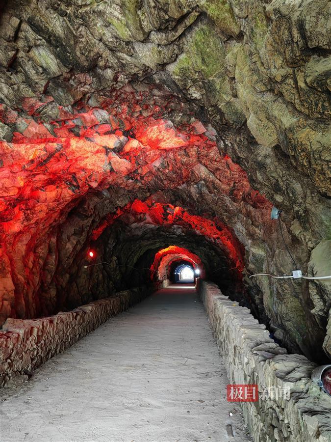 走进隧道,一股凉风拂面而来。隧道中安装的彩灯将洞里充满梦幻感。从隧道四壁上裸露的岩石不难看出,洞是从山间坚硬的石壁上硬凿出来的。