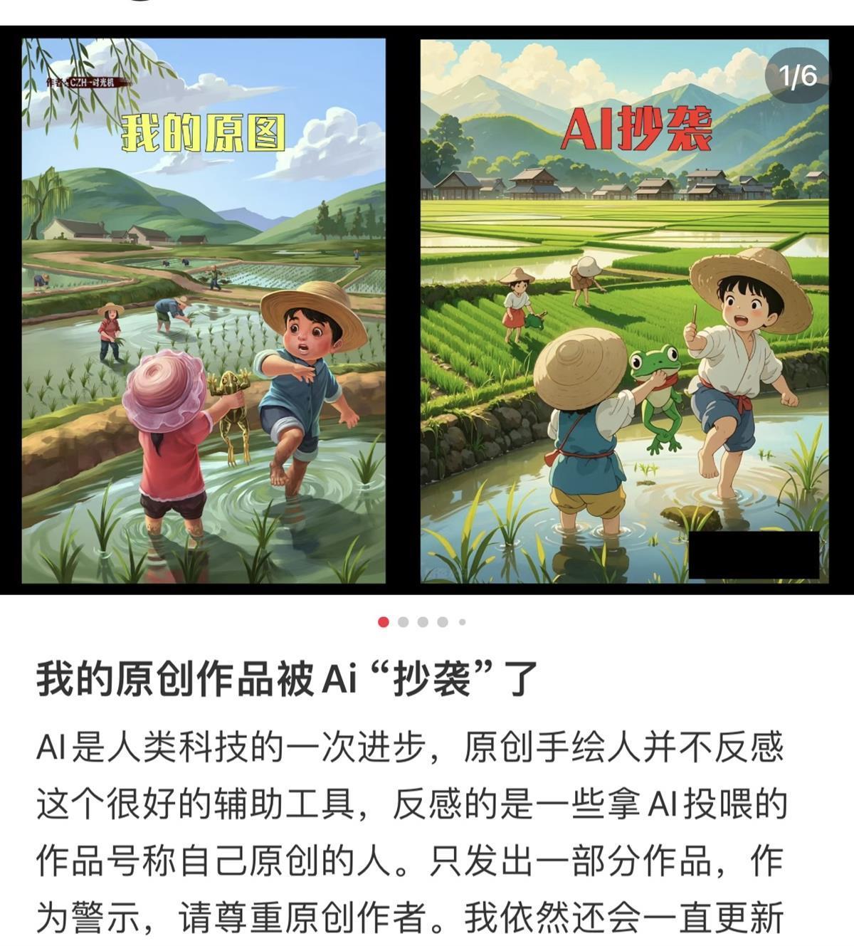 前不久,他发现有四五个账号发布的AI作品与自己的原创手绘作品高度相似。“内容、角度、角色都几乎一模一样,只是风格有区别,有五六张都是这样的情况。”陈先生称,其中部分账号的主页还标注了“AI插画师”“原创”等字眼。