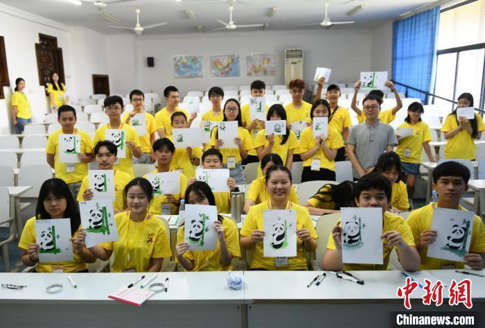 7月2日,华裔青少年在重庆学习趣味汉语,认识中国大熊猫,了解大熊猫的性格、生活习性、大熊猫保护区和保护措施等。当天,2024“中国寻根之旅”夏令营(重庆营)在重庆师范大学开营,来自印度尼西亚、俄罗斯、英国、美国、委内瑞拉的60名华裔青少年,将在为期10天的时间里,学习中国古诗词、书法、剪纸、武术等文化课程。还将走进白鹤梁水下博物馆、重庆中国三峡博物馆等地,“听”传统故事、“读”经典古诗、“学”中华文化、“阅”巴山渝水、“品”重庆风味、“看”重庆发展。图为趣味汉语课结束后,华裔青少年展示自己的大熊猫绘画作品。中新社记者 周毅 摄