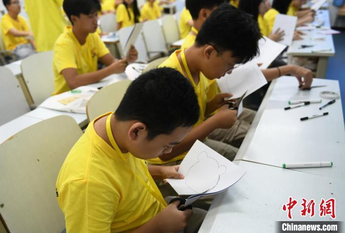 7月2日,华裔青少年在重庆学习趣味汉语,认识中国大熊猫,了解大熊猫的性格、生活习性、大熊猫保护区和保护措施等。当天,2024“中国寻根之旅”夏令营(重庆营)在重庆师范大学开营,来自印度尼西亚、俄罗斯、英国、美国、委内瑞拉的60名华裔青少年,将在为期10天的时间里,学习中国古诗词、书法、剪纸、武术等文化课程。还将走进白鹤梁水下博物馆、重庆中国三峡博物馆等地,“听”传统故事、“读”经典古诗、“学”中华文化、“阅”巴山渝水、“品”重庆风味、“看”重庆发展。图为华裔青少年在趣味汉语课堂上学习制作大熊猫样式的扇子。中新社记者 周毅 摄