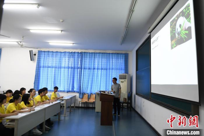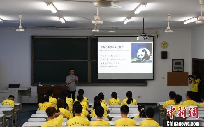 7月2日,华裔青少年在重庆学习趣味汉语,认识中国大熊猫,了解大熊猫的性格、生活习性、大熊猫保护区和保护措施等。当天,2024“中国寻根之旅”夏令营(重庆营)在重庆师范大学开营,来自印度尼西亚、俄罗斯、英国、美国、委内瑞拉的60名华裔青少年,将在为期10天的时间里,学习中国古诗词、书法、剪纸、武术等文化课程。还将走进白鹤梁水下博物馆、重庆中国三峡博物馆等地,“听”传统故事、“读”经典古诗、“学”中华文化、“阅”巴山渝水、“品”重庆风味、“看”重庆发展。图为趣味汉语课堂上,老师向华裔青少年介绍大熊猫的外形特点。中新社记者 周毅 摄