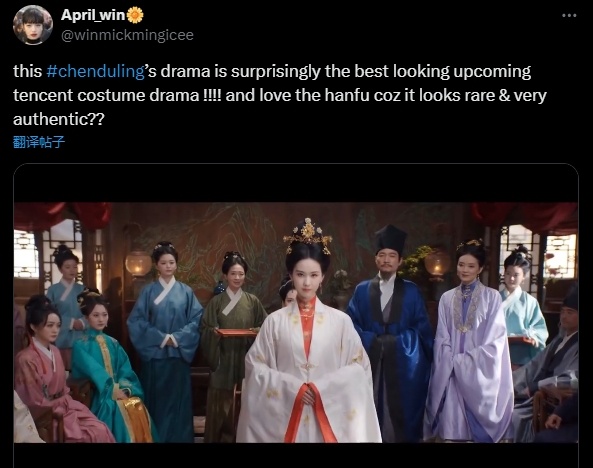 “喜欢(这部剧的)汉服,因为它看起来很罕见而且非常正宗。”