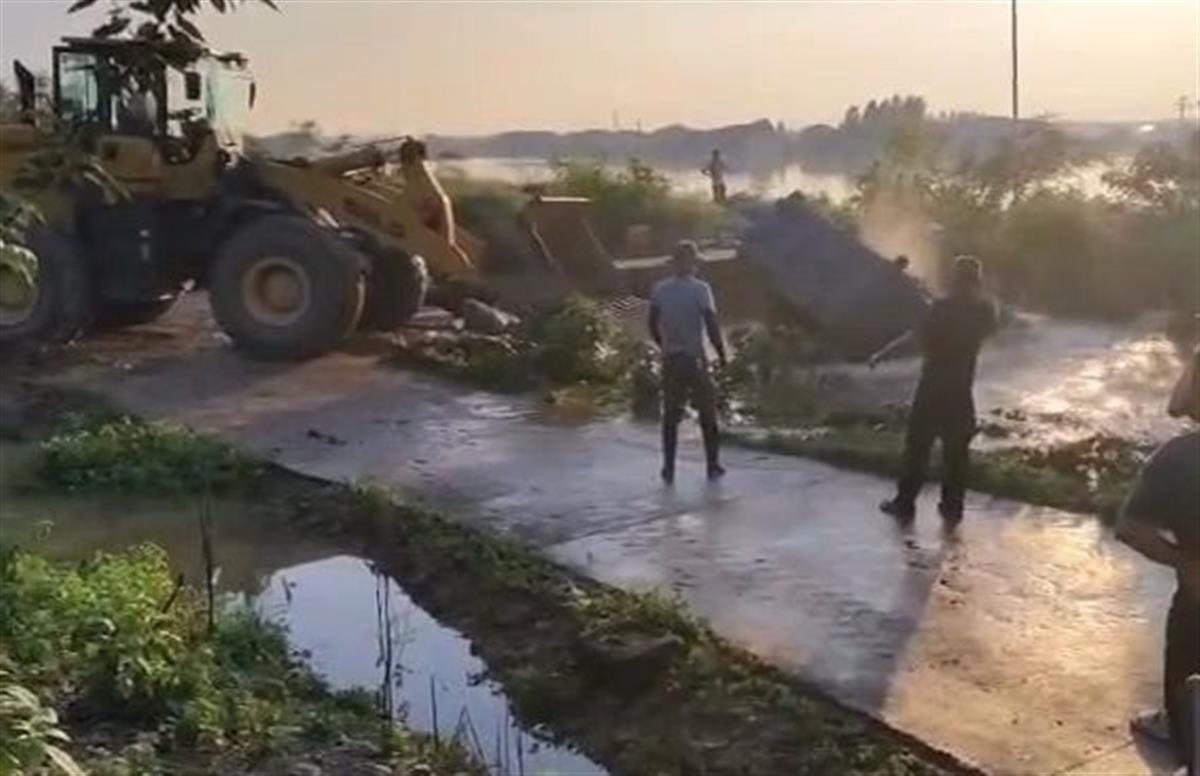 视频显示,一处堤坝出现缺口后,洪水不断从缺口处流出。在堤坝旁边,则停放了一辆载有石头和泥土的蓝色卡车,之后一辆铲车将卡车推入堤坝缺口。