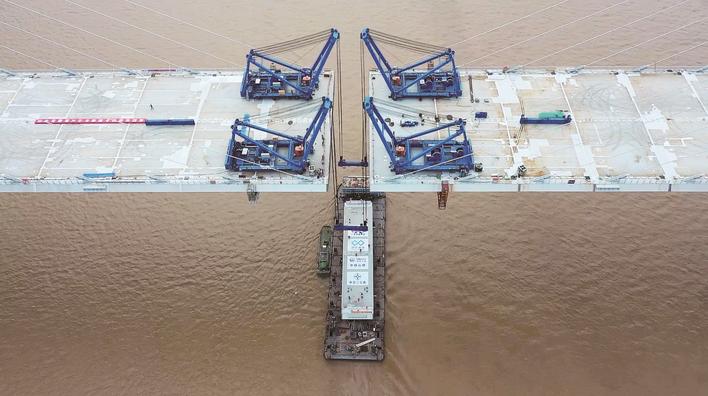 中铁大桥局投入自主研发的船舶“天一号”,是国内首创单体船型结构、全电力推进的海上架梁施工专用起重船。