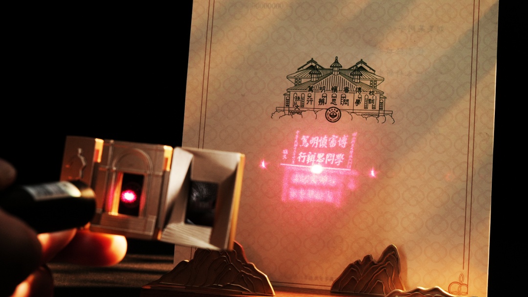 中山大学今年的录取通知书,礼盒内的“世纪之门”徽章采用数字“100”的形态汇聚光影,学生们通过光源(如手机手电筒)照射石英片后即可投射出孙中山先生亲手题写的中山大学校训的图案。