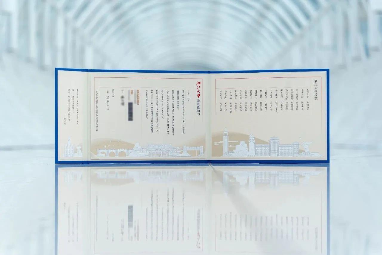 浙江大学本科录取通知书呈长画卷的形式,展开仿佛一幅求学蓝图。内页选用特殊透光材质,透过阳光可映现出学校求是大讲堂上空的灿若星辰灯。
