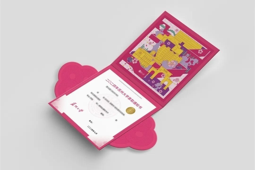 打开两瓣花窗,翻开苏州大学录取通知书内页,活泼绚丽的桃花坞年画校园展现在眼前。学子们可以通过色彩的分层与重合,来体验桃花坞年画“一版一色”套印而成的魅力。