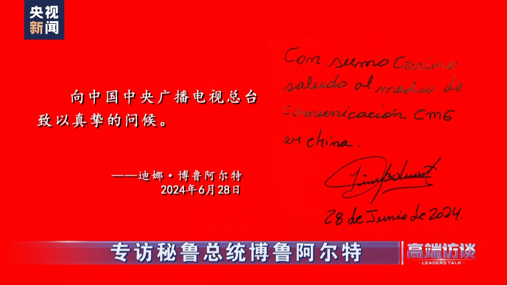△秘鲁总统博鲁阿尔特在接受总台专访后题词