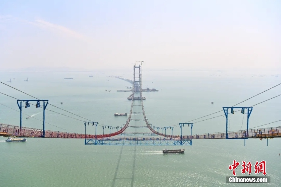 2022年5月3日,广东省中山市,货轮从深中通道伶仃洋大桥猫道下通过。 中新社记者 陈骥旻 摄