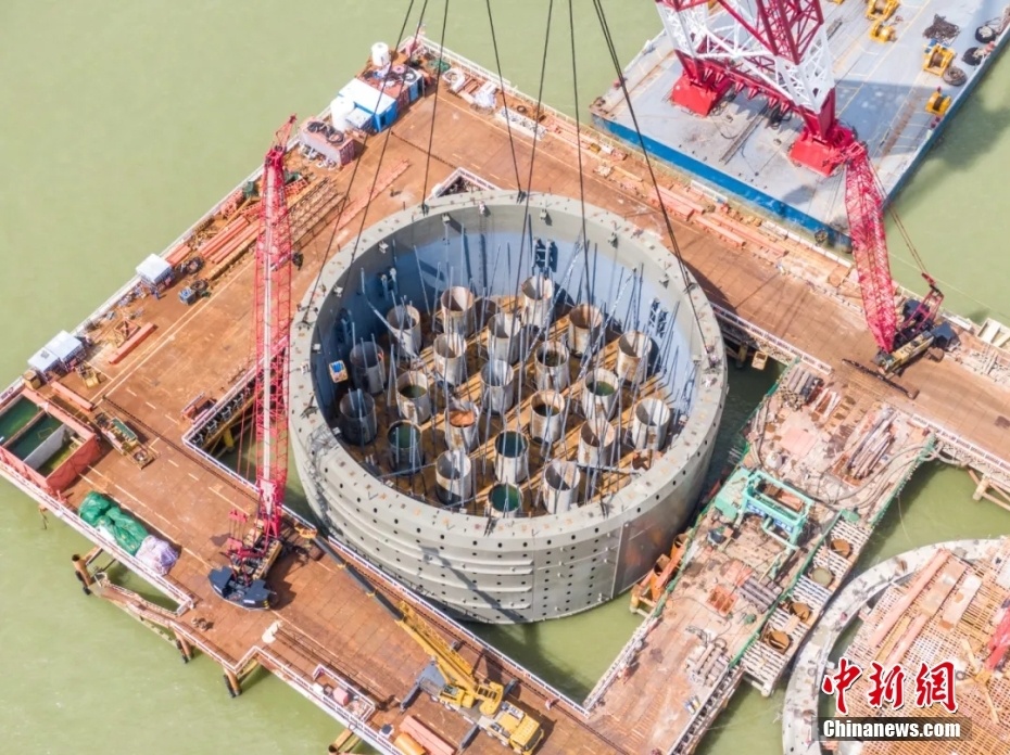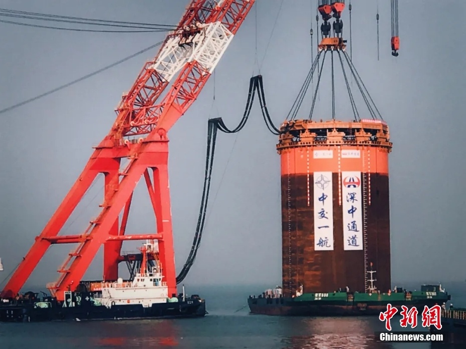2017年5月1日,4000吨起重船起吊钢圆筒,深圳至中山跨江通道首个钢圆筒扎根珠江,标志着深中通道建设进入实质性的实体工程施工阶段。 中新社发 欧阳征朝 摄