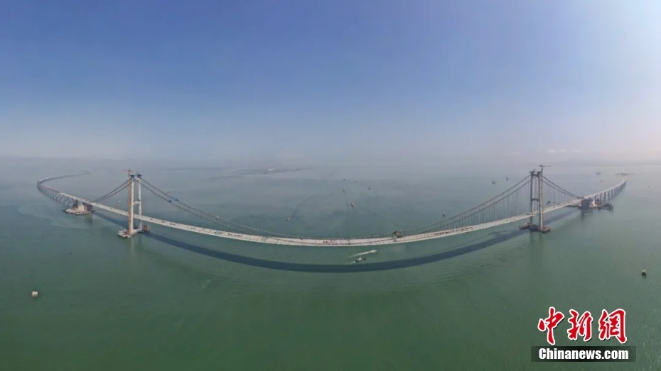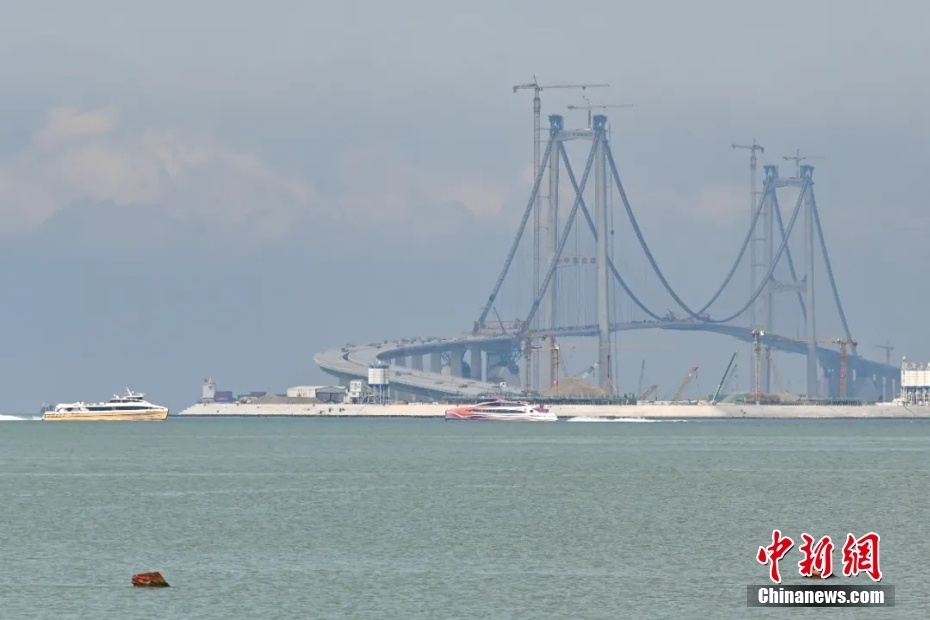 2023年11月28日,中国国家重大工程、粤港澳大湾区超级工程深中通道主线全线贯通。图为深中通道伶仃洋大桥与西人工岛。 中新社记者 陈骥旻 摄