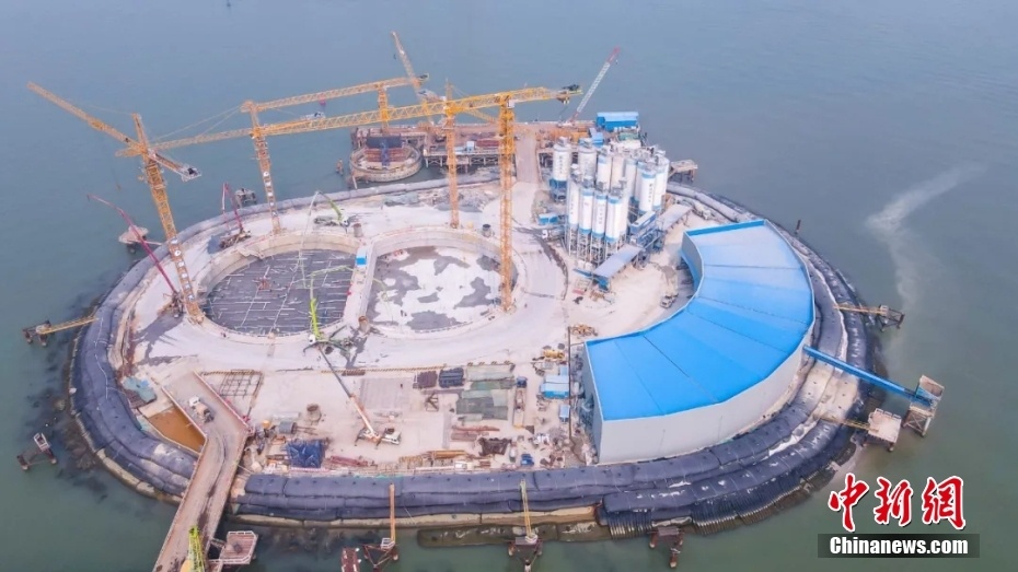 2021年3月12日,粤港澳大湾区核心工程深中通道伶仃洋大桥西锚碇填芯施工完成。伶仃洋大桥锚碇是世界最大海中悬索桥锚碇。 中新社发 陈旭彬 摄