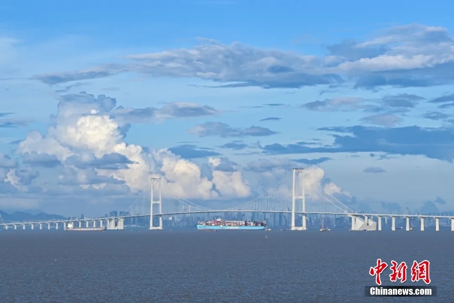 2024年6月28日,广州南沙远眺蓝天碧海之间的深中大桥。 中新社记者 陈骥旻 摄