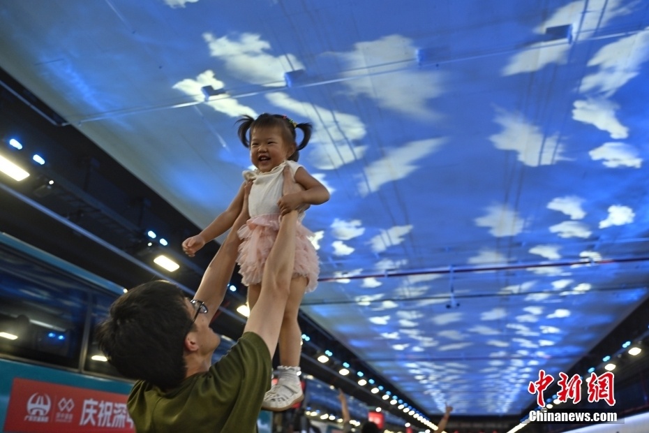 2024年6月30日,粤港澳大湾区核心工程深中通道通车试运营,一名工程建设者在深中隧道内参观时举起自己的女儿。 中新社记者 陈骥旻 摄