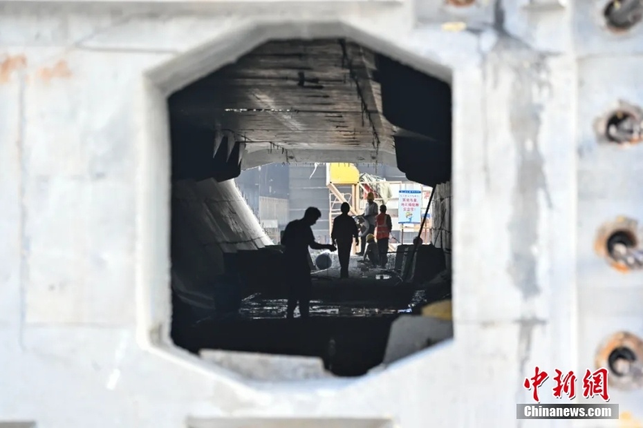 2023年6月11日,世界最长最宽钢壳混凝土沉管隧道——深中通道海底隧道最终接头推出,贯通测量结果表明,实现了与东侧E24管节精准对接。 中新社记者 陈骥旻 摄