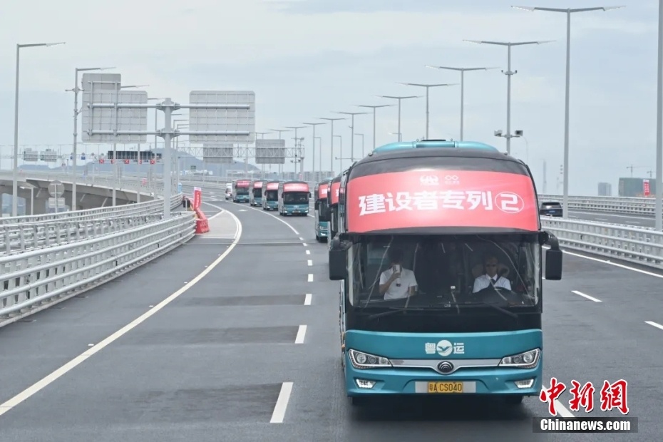 2024年6月30日,粤港澳大湾区核心工程深中通道通车试运营,建设者专列车队行驶在深中大桥上。 中新社记者 陈骥旻 摄