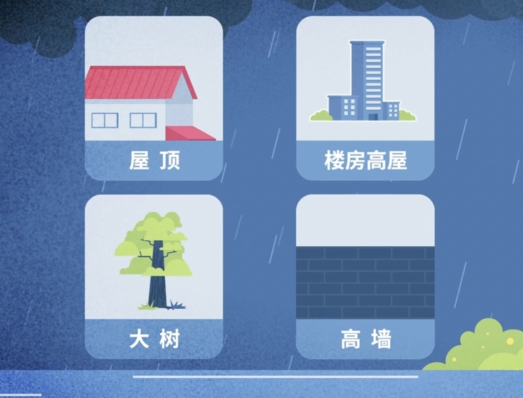 2.寻找高处避险。若洪水来得太快,来不及转移时,要立即爬上屋顶、楼房高层、大树、高墙等暂时避险,等待救援,不要独自游水转移。