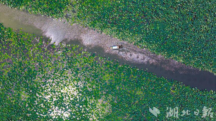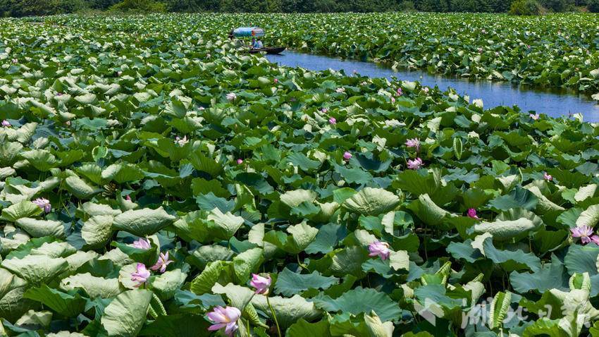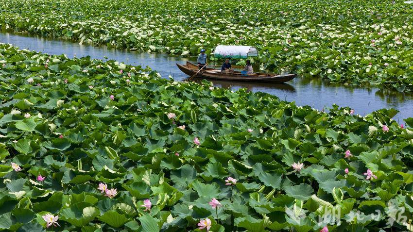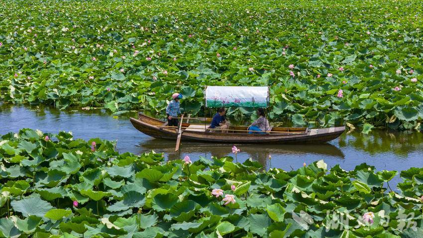 7月6日,汉川市汈汊湖国家湿地公园,游客泛舟荷塘赏莲。6月8日开园迎客以来,汈汊湖已成为生态旅游“网红打卡点”,越来越多的省内外游客慕名而来。