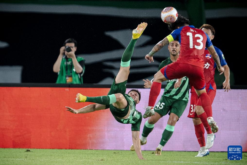 7月7日,浙江队球员卢卡斯(左一)在比赛中倒钩射门。新华社记者 江汉 摄