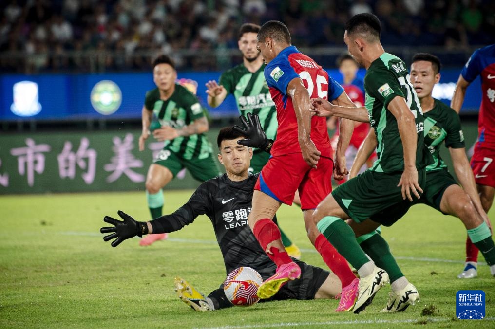 7月7日,浙江队球员莱昂纳多(左二)射门得分。新华社记者 江汉 摄