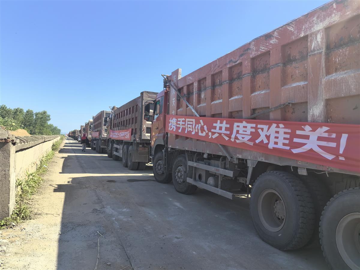 决口中,横着三艘船同时作业,两岸的自卸载重货车不断地将石料倒入水中,岸边的推土机往前行进,整理石料。