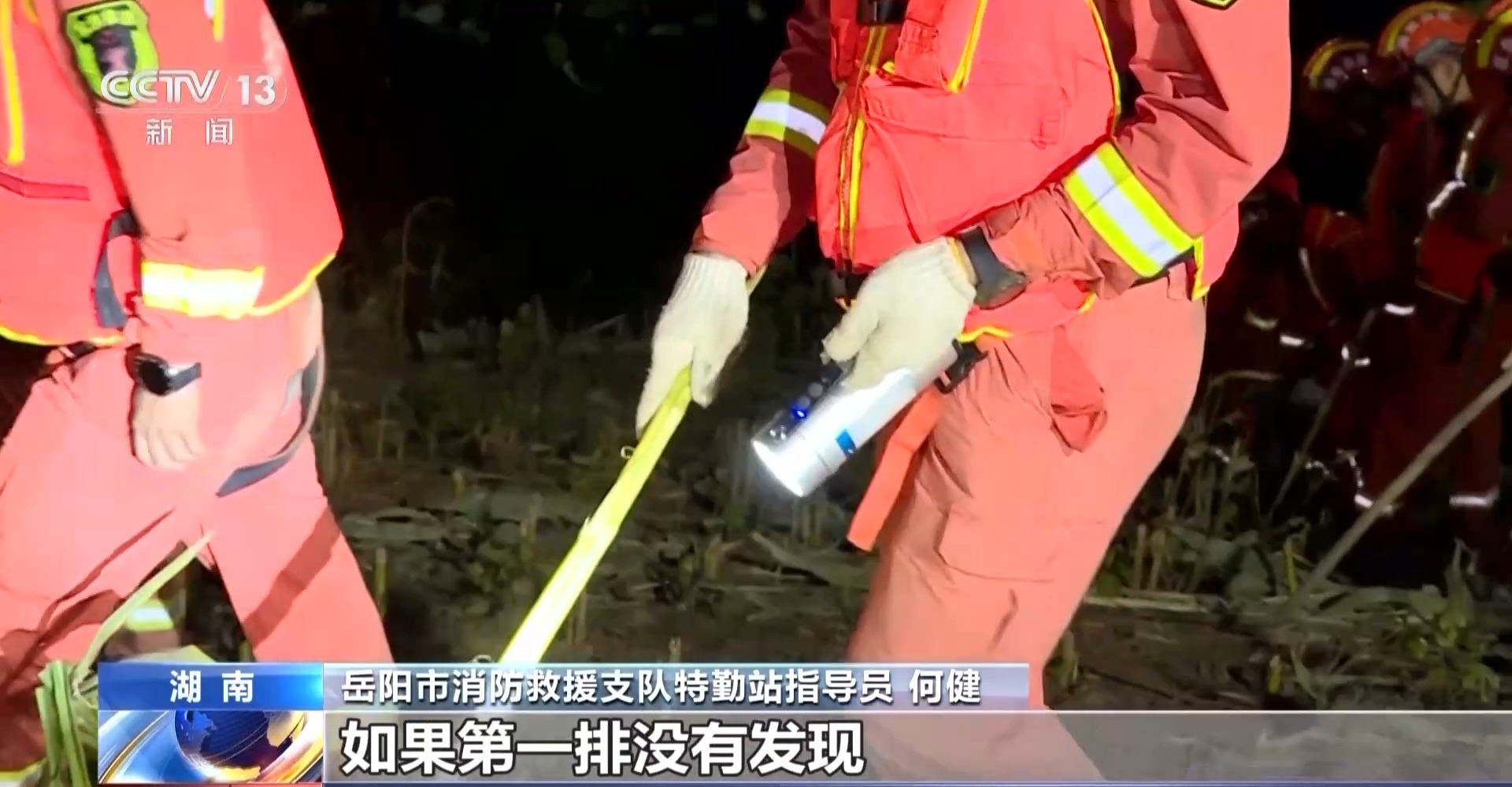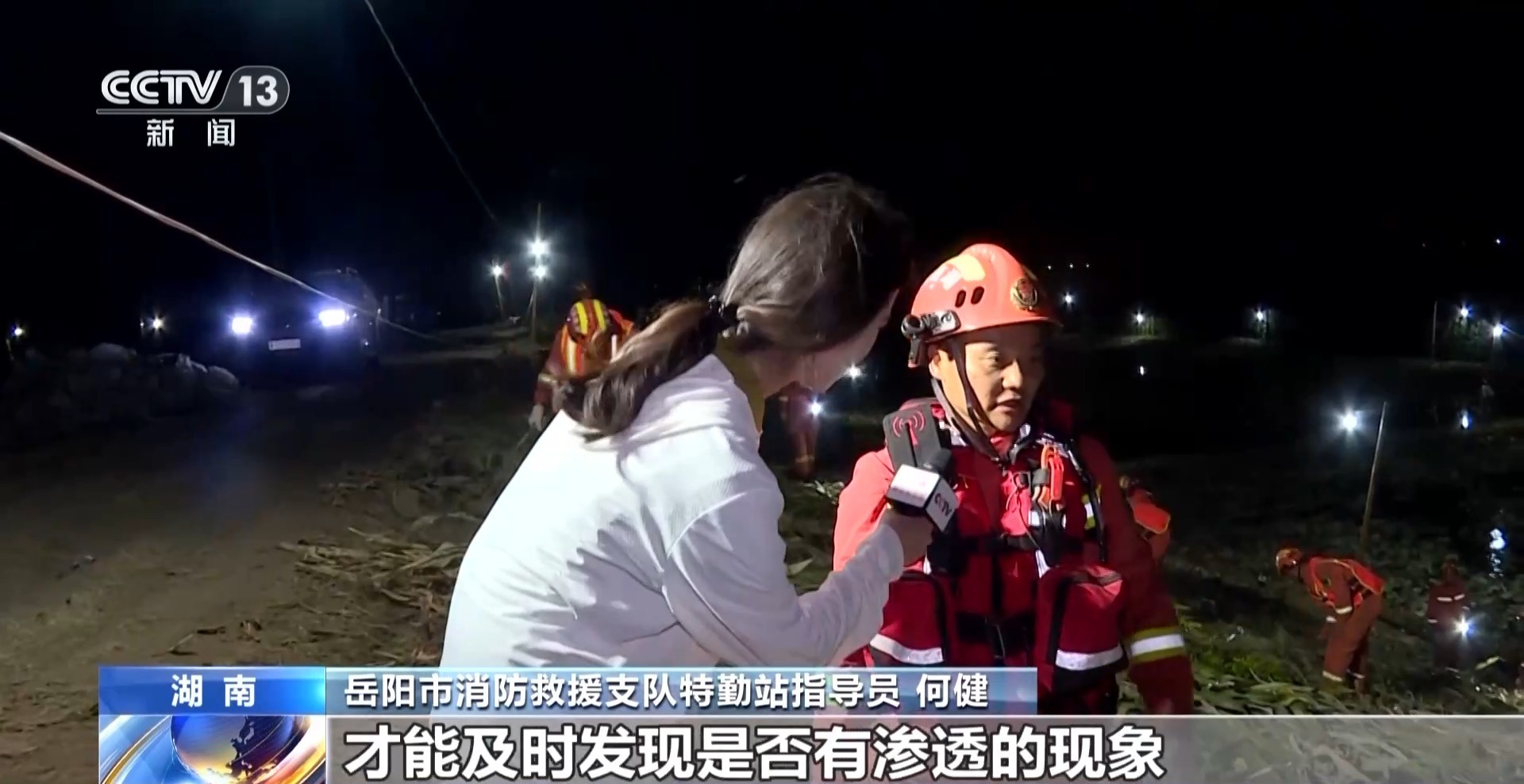 岳阳市消防救援支队特勤站指导员 何健:因为巡堤是慢工精细活,只求精细不求快,每次巡堤必须仔细,晚上就更难,只能打着手电细细地寻找,如果第一排没有发现,我们第二排可以及时补漏。
