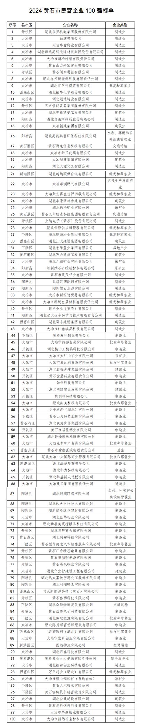 荆楚网(湖北日报网)讯(记者 阮琼 通讯员 李玉)“民营经济增加值占GDP比重达60.5%,已成为市域经济的重要支撑……”7月9日,在黄石市促进民营经济健康发展新闻发布会上,黄石市委统战部副部长、市工商联党组书记柯碧松公布《2024黄石市民营企业100强榜单》。