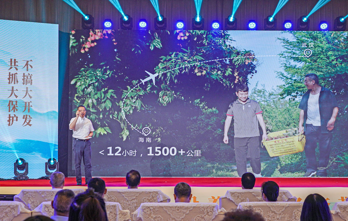 顺丰集团副总裁孙玉松一上台就向观众展示了一枚从海南空运而来的荔枝,从海南至武汉只花了一天。