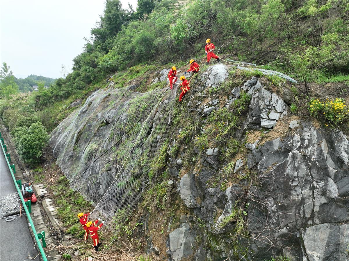 30分钟内,麻阳高速北段20名应急突击队员火速集结,手拿肩扛锚杆、防护网等施工材料,向十余米高的坡顶攀爬。10分钟后,坡顶传来风镐的阵阵轰鸣,一排排孔道交错布设,紧接着锚杆紧固着防护网被根植于坚硬的岩体之中,随着一联联防护网由上而下的铺设、锚定,在坡面整体形成了一层钢筋铁骨的防护。经过4个小时的奋战,边坡隐患成功消除,本次应急演练圆满完成。