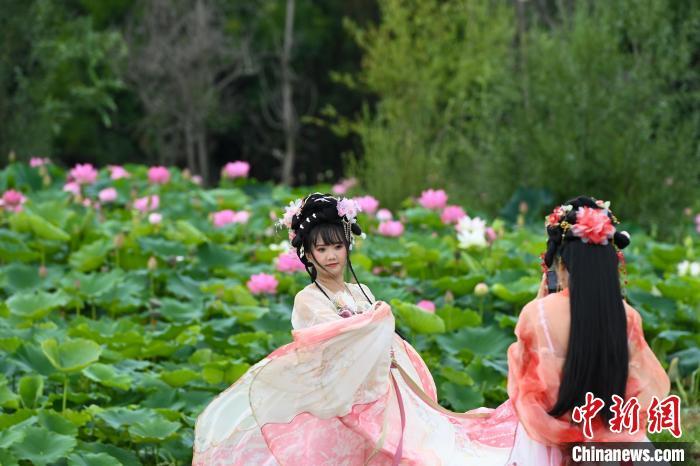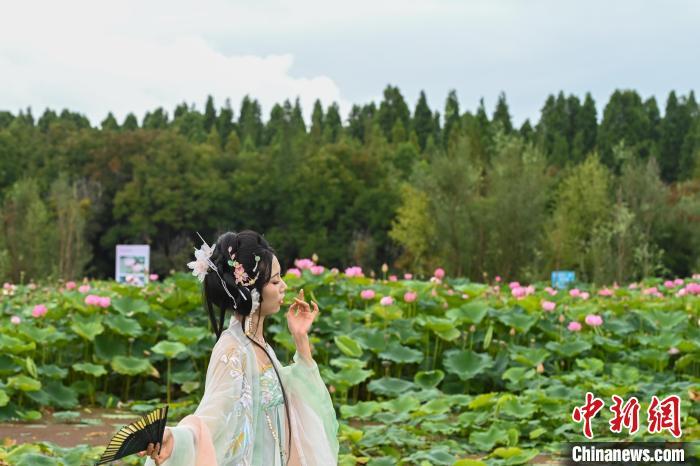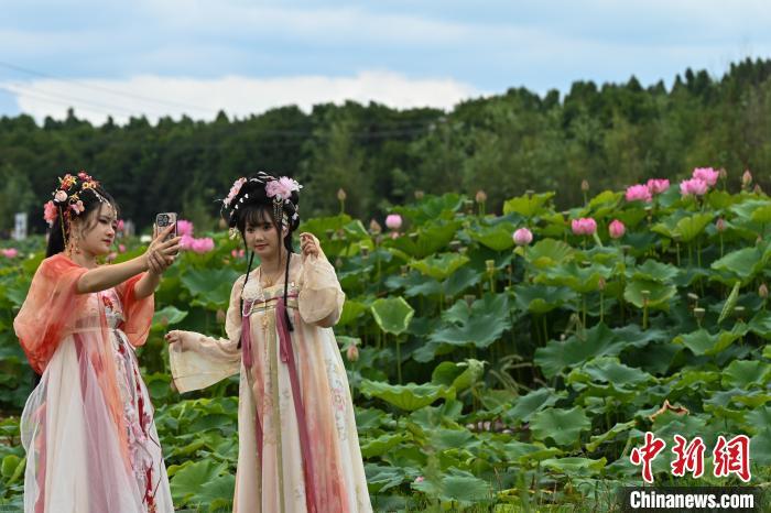 7月10日,游客身穿汉服在在荷塘边拍照。当日,云南省昆明市呈贡区斗南街道2024年“‘荷’和美美 趣游江尾”荷花节主题活动举行,吸引市民、游客前来品味“夏日荷韵”。中新社记者 李嘉娴 摄