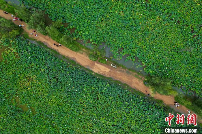 7月10日,游客在荷塘边赏荷。当日,云南省昆明市呈贡区斗南街道2024年“‘荷’和美美 趣游江尾”荷花节主题活动举行,吸引市民、游客前来品味“夏日荷韵”。(无人机照片)中新社记者 李嘉娴 摄