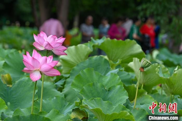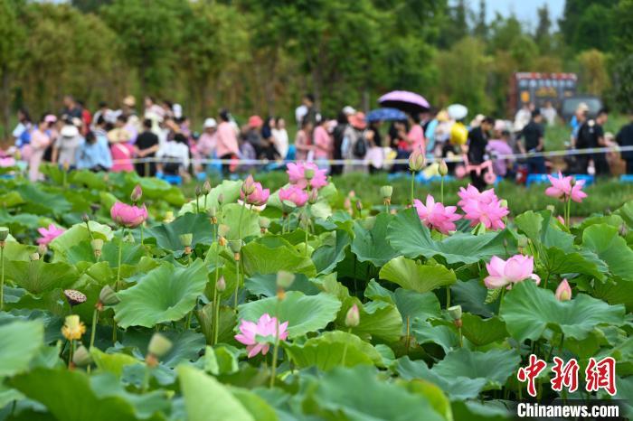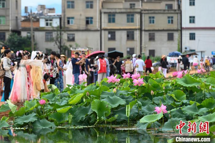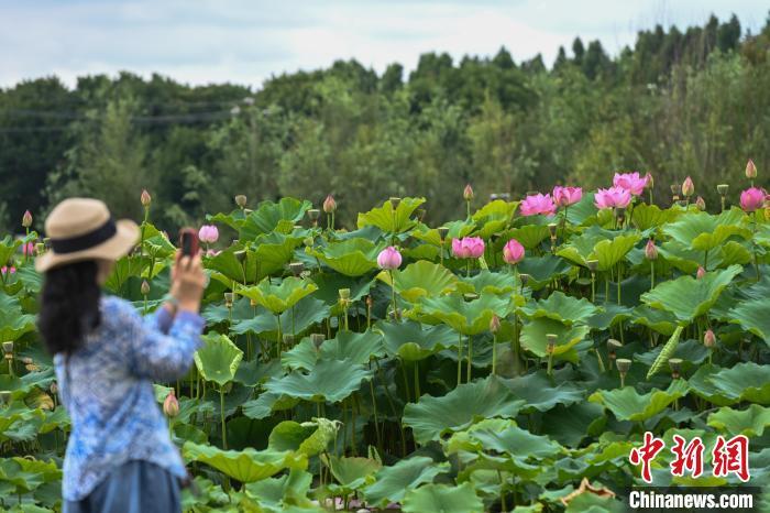 7月10日,盛放的荷花吸引游客拍照。当日,云南省昆明市呈贡区斗南街道2024年“‘荷’和美美 趣游江尾”荷花节主题活动举行,吸引市民、游客前来品味“夏日荷韵”。中新社记者 李嘉娴 摄
