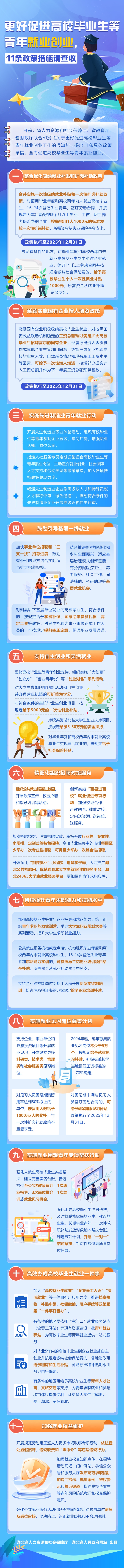 近日,湖北省人力资源和社会保障厅、省教育厅、省财政厅联合印发《关于更好促进高校毕业生等青年就业创业工作的通知》,提出11条具体政策举措,全力促进高校毕业生等青年就业创业。具体事项如下: