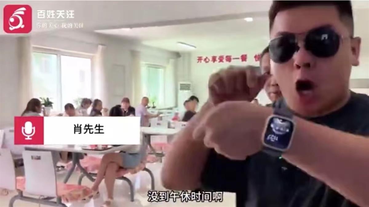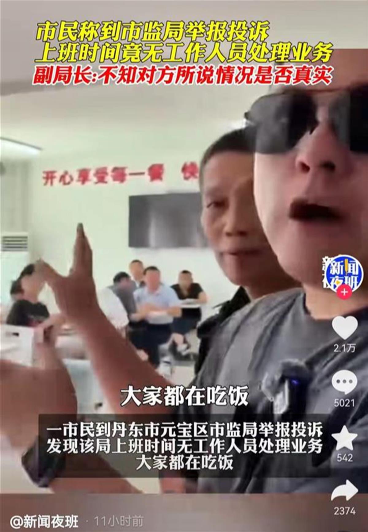 肖先生称,上午11点10分,自己给辖区的市场监督管理局打电话,没人接,自己和同伴就驱车赶往该单位,结果到了市场监督管理局以后,保安说现在下班午休了,他到了二楼食堂一看,全单位的人都在食堂吃饭,当时时间是11点26分。自己又走了几个科室和一些办证大厅,都是空无一人,该单位的副局长还为此事给自己道了歉。