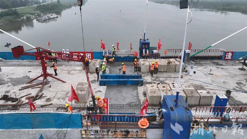 钟祥汉江特大桥主桥位于钟祥石牌镇张家台附近,全长547.5米,设计主跨270米,以斜拉桥形式跨越汉江航道,是沪渝蓉高铁武宜段重点控制性工程。大桥316号主塔总高114米,317号主塔总高104.5米,均为H形桥塔,全桥64对斜拉索,采用牵索挂篮悬臂浇筑法施工,以两个主墩零号块为“支点”分别向两端延伸,直至边跨、中跨合龙。