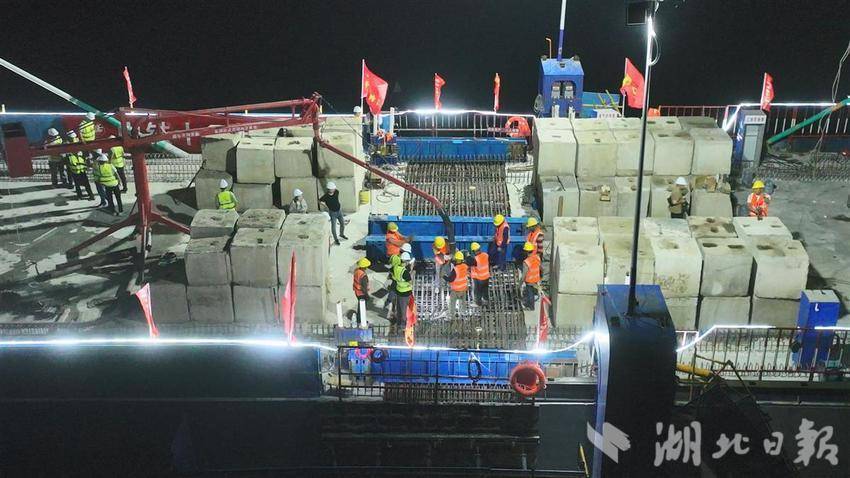 当日凌晨,现场灯火通明,施工人员正对大桥的合龙段进行混凝土浇筑。技术主管周小刚介绍,大桥合龙段长3米,宽14.5米,需浇筑60立方米混凝土,浇筑历时3.5小时。