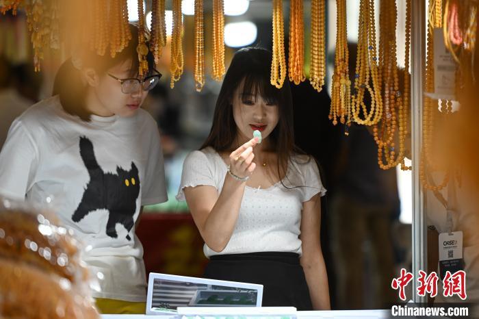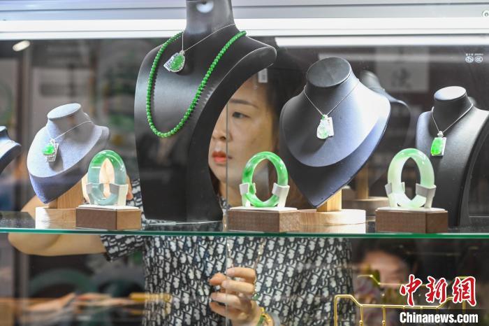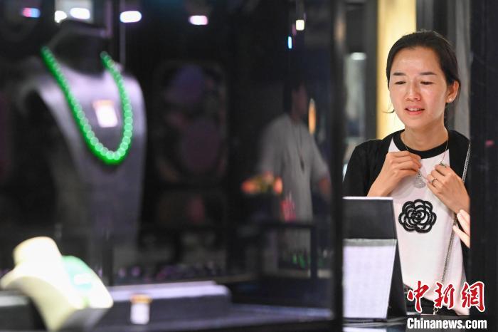 7月11日,参观者挑选玉石饰品。当日,2024中国昆明国际石博览会暨云南国际珠宝玉石展开幕,本届石博会围绕“珠宝玉石、赏石文化、非遗工艺”三大核心板块,设置国际品牌珠宝馆、时尚首饰馆、玉石翡翠馆、奇石馆、工艺美术馆。中新社记者 李嘉娴 摄