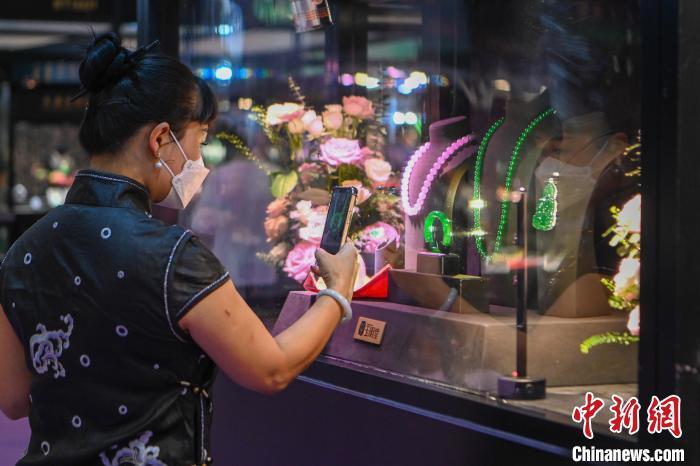 7月11日,展出的翡翠饰品吸引参观者拍照。当日,2024中国昆明国际石博览会暨云南国际珠宝玉石展开幕,本届石博会围绕“珠宝玉石、赏石文化、非遗工艺”三大核心板块,设置国际品牌珠宝馆、时尚首饰馆、玉石翡翠馆、奇石馆、工艺美术馆。中新社记者 李嘉娴 摄