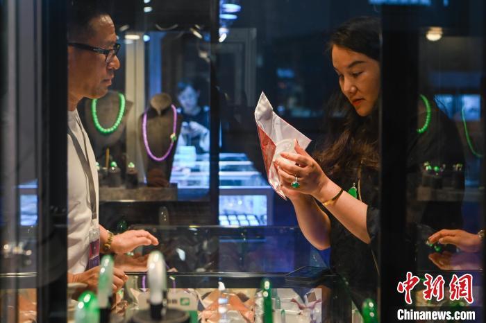 7月11日,参展商整理翡翠展柜。当日,2024中国昆明国际石博览会暨云南国际珠宝玉石展开幕,本届石博会围绕“珠宝玉石、赏石文化、非遗工艺”三大核心板块,设置国际品牌珠宝馆、时尚首饰馆、玉石翡翠馆、奇石馆、工艺美术馆。中新社记者 李嘉娴 摄