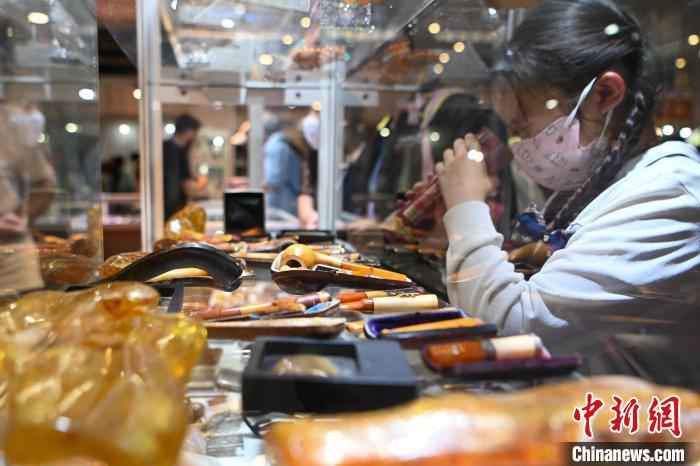 7月11日,来自阿富汗的蜜蜡工艺品吸引小朋友。当日,2024中国昆明国际石博览会暨云南国际珠宝玉石展开幕,本届石博会围绕“珠宝玉石、赏石文化、非遗工艺”三大核心板块,设置国际品牌珠宝馆、时尚首饰馆、玉石翡翠馆、奇石馆、工艺美术馆。中新社记者 李嘉娴 摄