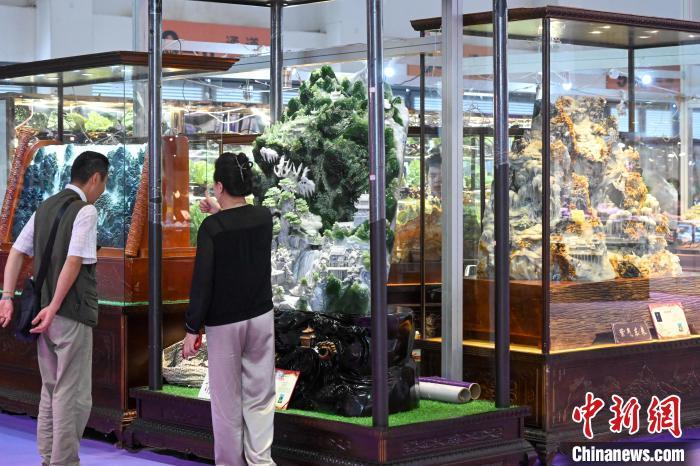 7月11日,玉石雕刻作品吸引参观者。当日,2024中国昆明国际石博览会暨云南国际珠宝玉石展开幕,本届石博会围绕“珠宝玉石、赏石文化、非遗工艺”三大核心板块,设置国际品牌珠宝馆、时尚首饰馆、玉石翡翠馆、奇石馆、工艺美术馆。中新社记者 李嘉娴 摄