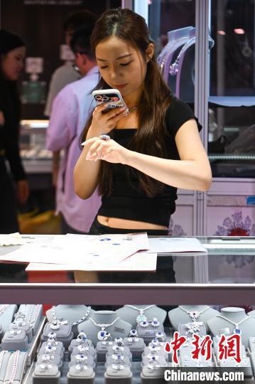 7月11日,参展商为蓝宝石首饰拍照。当日,2024中国昆明国际石博览会暨云南国际珠宝玉石展开幕,本届石博会围绕“珠宝玉石、赏石文化、非遗工艺”三大核心板块,设置国际品牌珠宝馆、时尚首饰馆、玉石翡翠馆、奇石馆、工艺美术馆。中新社记者 李嘉娴 摄