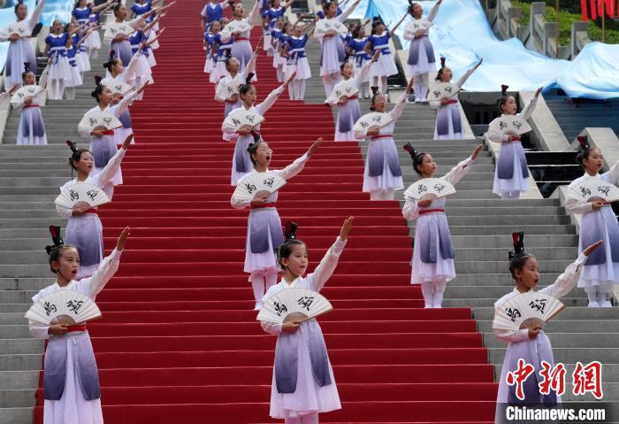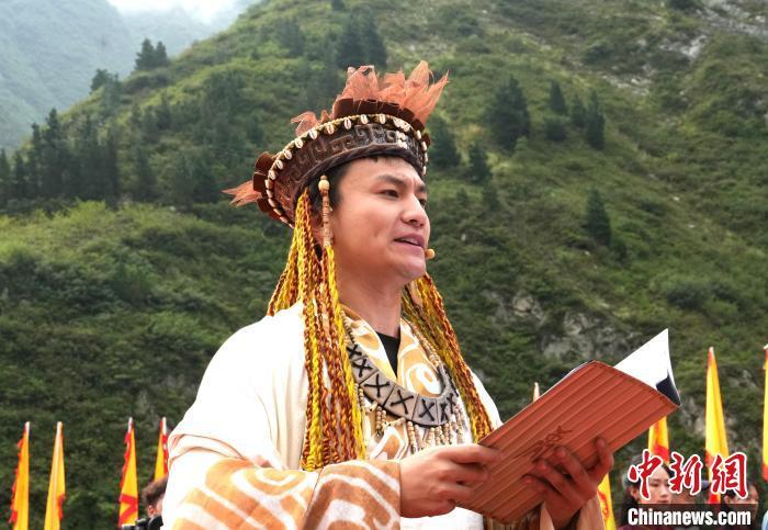 7月11日,2024汶川大禹华诞拜谒大典在“大禹故里”汶川县国家4A级大禹文化旅游区举行。参加庆典活动的嘉宾和当地民众怀着无比虔诚的心齐聚于此,共同缅怀“治水英雄”——大禹的丰功伟绩。图为诵读祭文。中新社记者 安源 摄