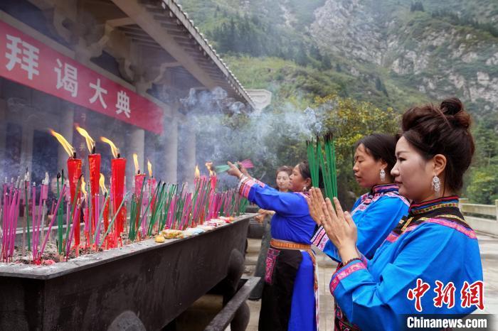 7月11日,2024汶川大禹华诞拜谒大典在“大禹故里”汶川县国家4A级大禹文化旅游区举行。参加庆典活动的嘉宾和当地民众怀着无比虔诚的心齐聚于此,共同缅怀“治水英雄”——大禹的丰功伟绩。图为当地民众祭拜现场。中新社记者 安源 摄