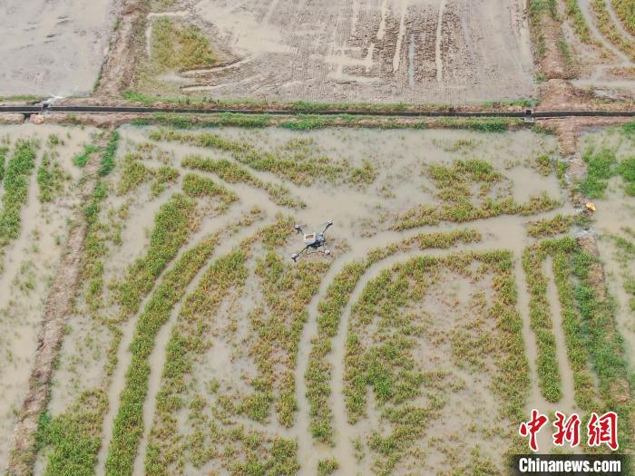 7月11日,航拍江西永修县白槎镇郭坂村一处被洪水淹过的稻田,无人机正在开展灾后补种作业。永修县地处江西五大河流之一的修河下游,境内水系发达,也是江西省6月中下旬开始的洪涝和地质灾害的主灾区之一,洪涝灾害导致该县部分农作物受灾严重。(无人机照片)中新社记者 刘力鑫 摄