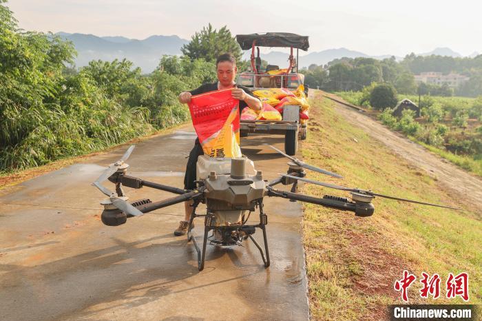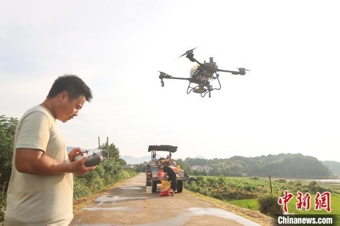 7月11日,江西永修县白槎镇郭坂村,农用无人机操作员熊文明(图左)操作无人机起飞,准备对一处被洪水淹过的稻田开展灾后补种施肥作业。永修县地处江西五大河流之一的修河下游,境内水系发达,也是江西省6月中下旬开始的洪涝和地质灾害的主灾区之一,洪涝灾害导致该县部分农作物受灾严重。中新社记者 刘力鑫 摄